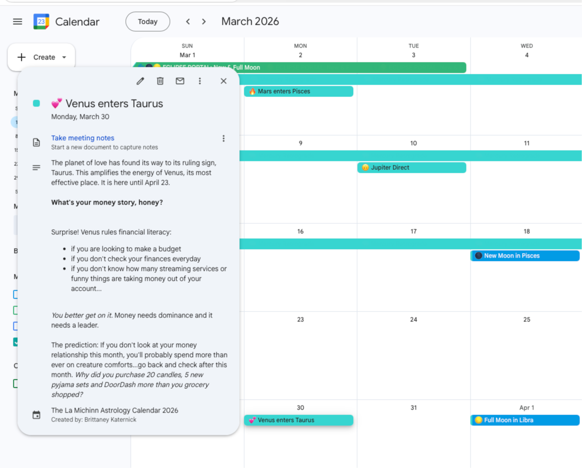 Lunar cycles, planetary movements, and embodied prompts, delivered directly into your calendar.